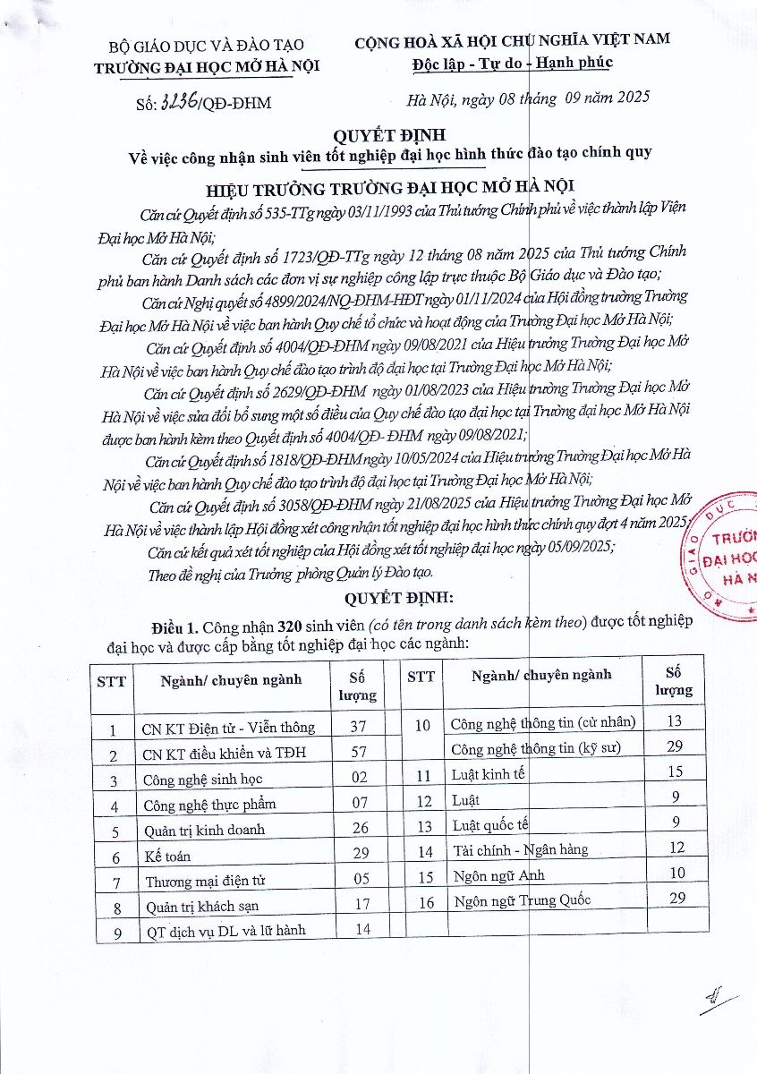 Thông báo QĐ số 3236/QĐ-ĐHM và Danh sách SV được công nhận tốt nghiệp đợt 3 năm 2025