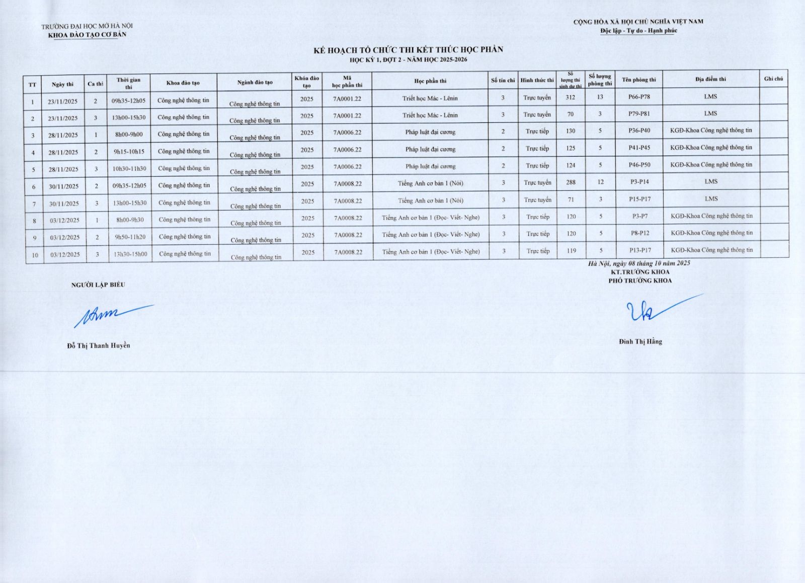 Ban thư ký HĐ thi hết học phần HK1 năm học 2025-2026 thông báo lịch thi các học phần Triết, Pháp luật ĐC, tiếng Anh cơ bản 1