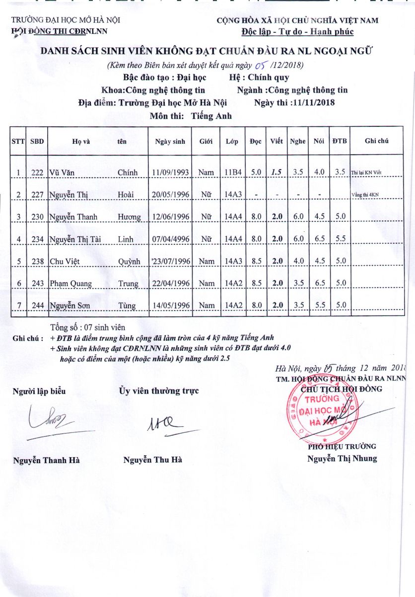 Kết quả thi chuẩn đầu ra NLNN đợt 3 (thi tháng 11) năm 2018