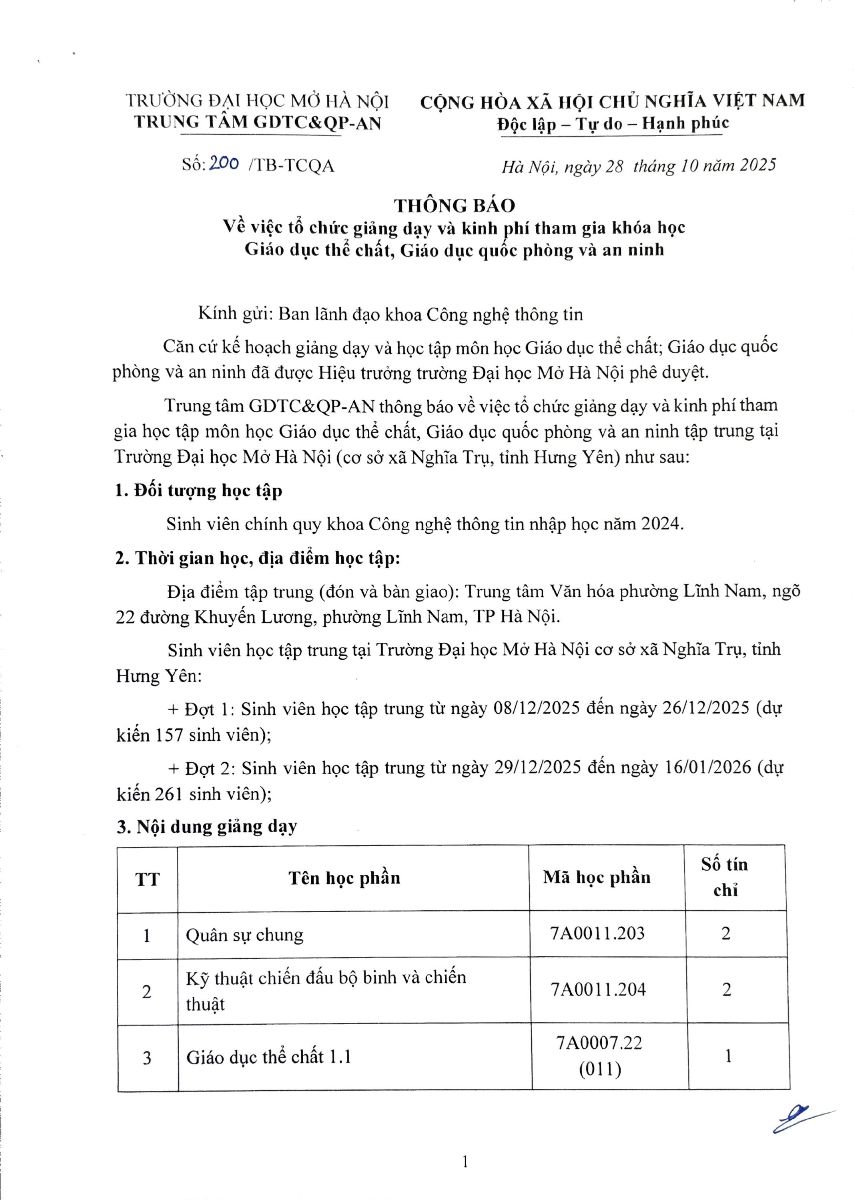 Khoa Công nghệ Thông tin – Trường Đại học Mở Hà Nội thông báo đến sinh viên chính quy khóa nhập học năm 2024 về lịch thu kinh phí tham gia khóa học GDTC và GDQP&AN như sau: