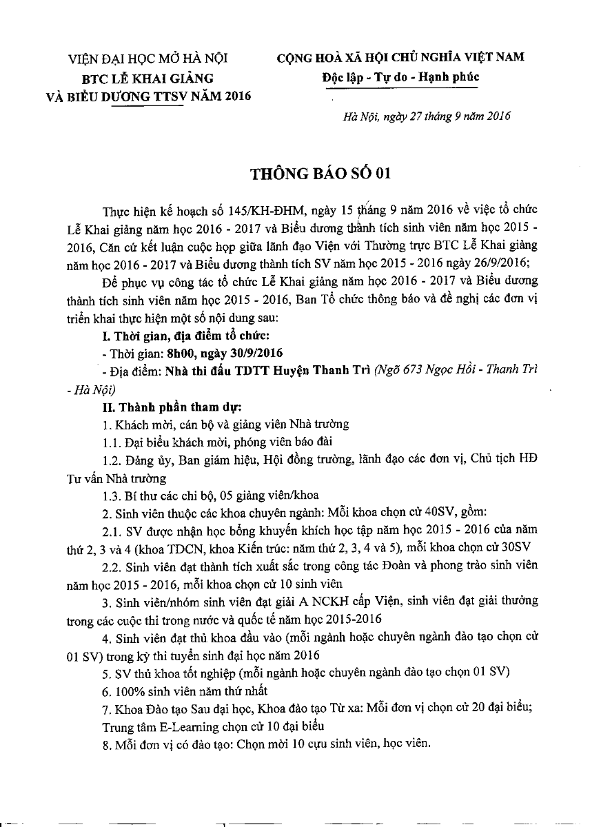 Thông báo số 01 của BTC Lễ Khai giảng và Biểu dương TTSV năm 2016
