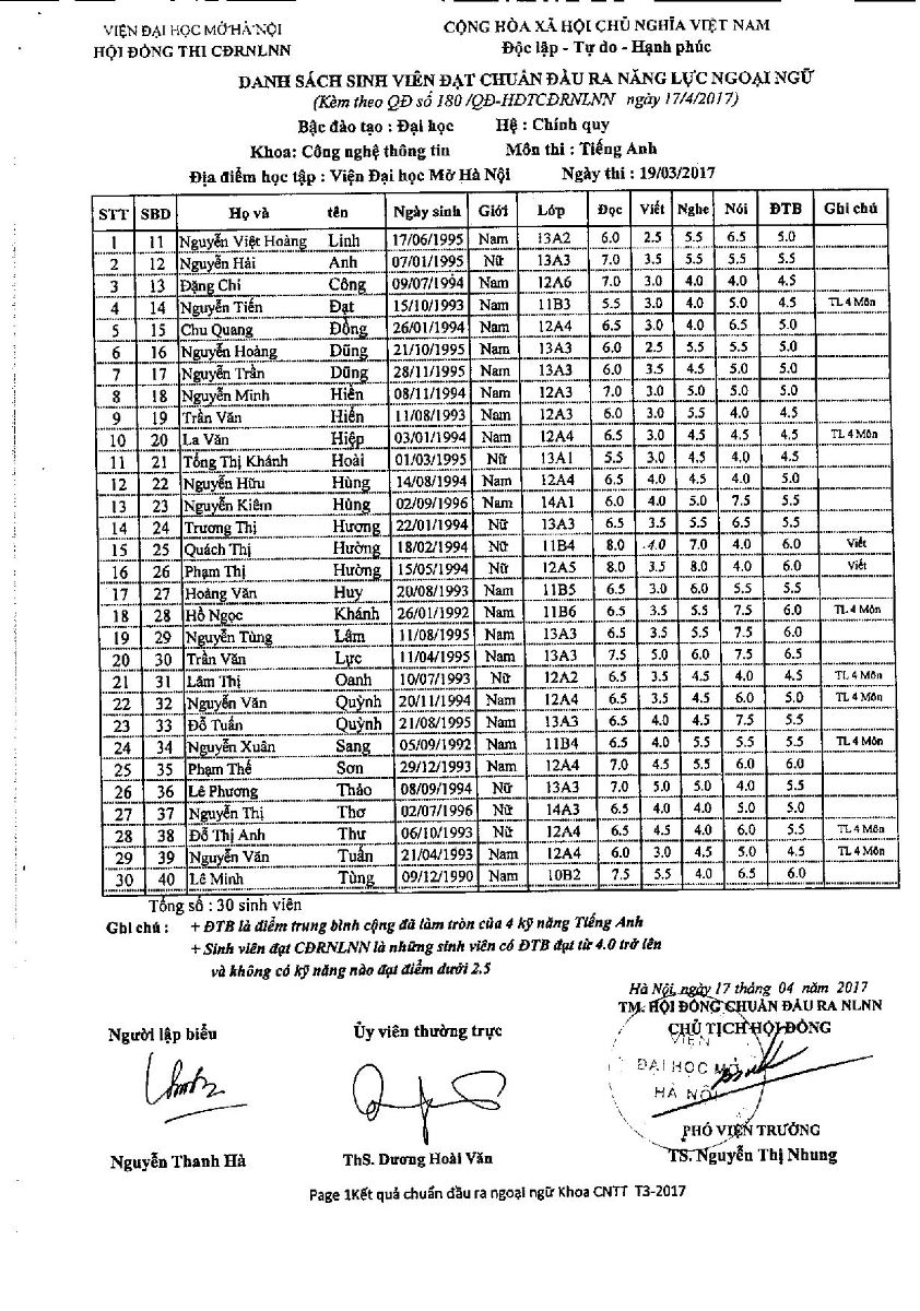 Kết quả chuẩn đầu ra NL Ngoại ngữ đợt 2 năm 2017