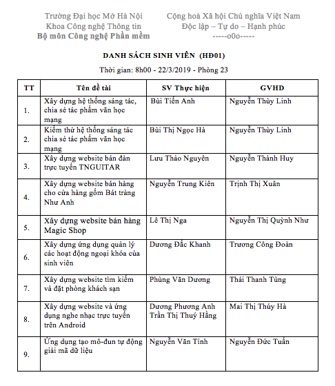 1. Lịch báo cáo của hội đồng HĐ01 đổi sang 8h00, thứ 6 ngày 22/03/2019.