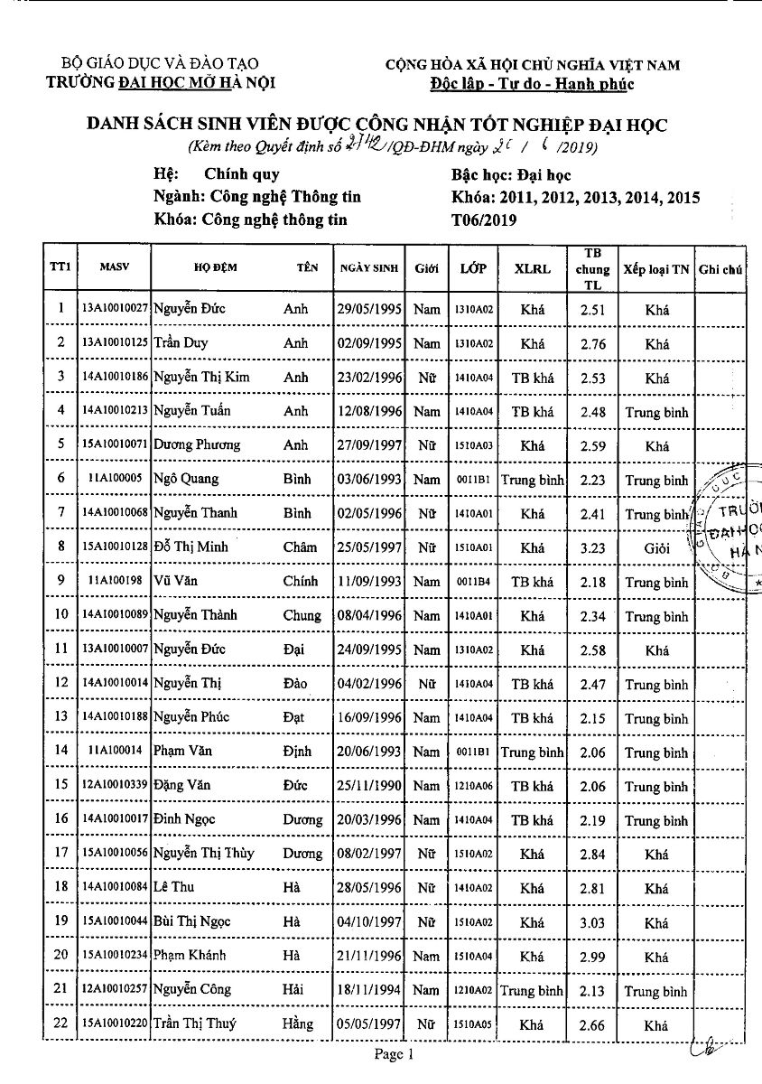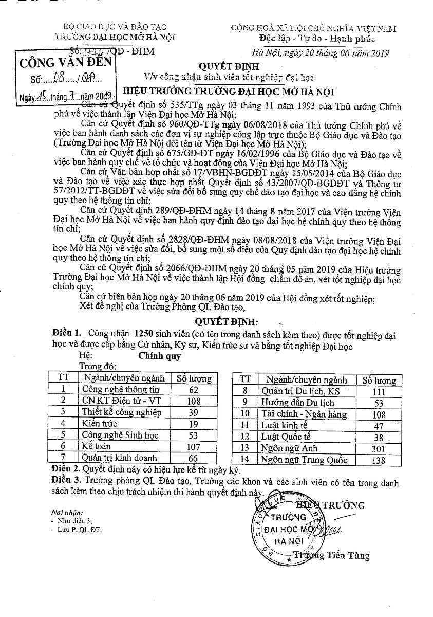Quyết định 2742/QĐ-ĐHM v/v công nhận tốt nghiệp Đại học (đợt tháng 6 năm 2019)