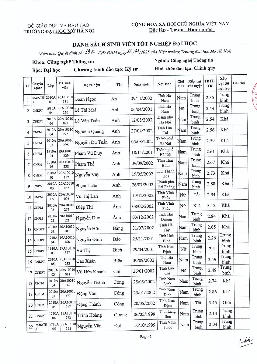 Thông báo QĐ số 392/QĐ-ĐHM và Danh sách SV được công nhận tốt nghiệp đợt 1 năm 2025