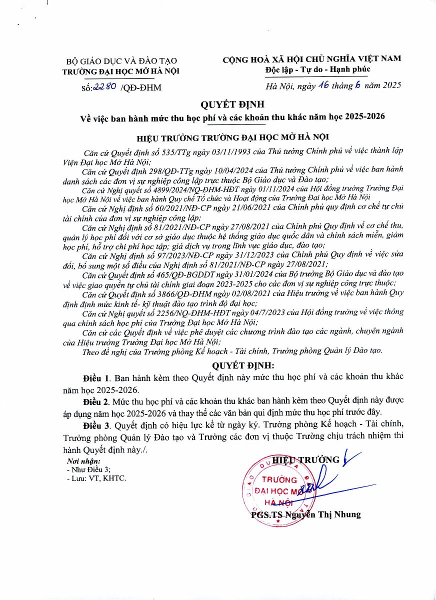 Quyết định số 2280/QĐ-ĐHM ngày 16/6/2025 của nhà trường v/v ban hành mức thu học phí và các khoản thu khác năm học 2025-2026.