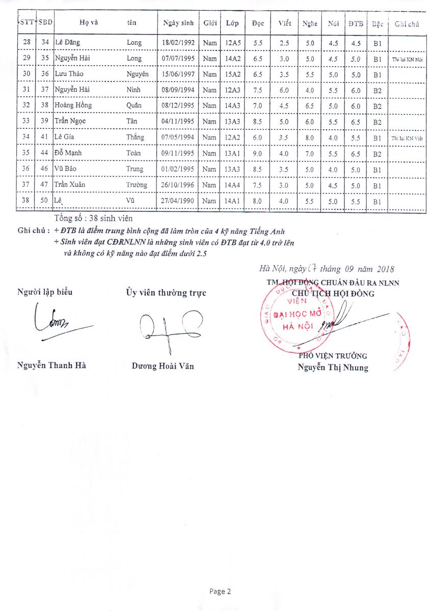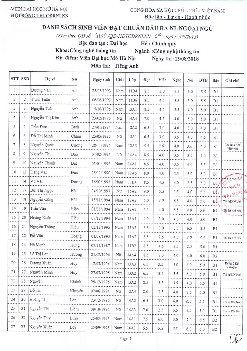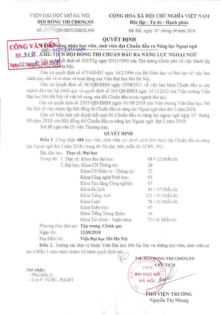 Đã có quyết định của nhà trường về kết quả thi chuẩn đầu ra NLNN đợt 2 (tháng 8) năm 2018, chi tiết như sau: