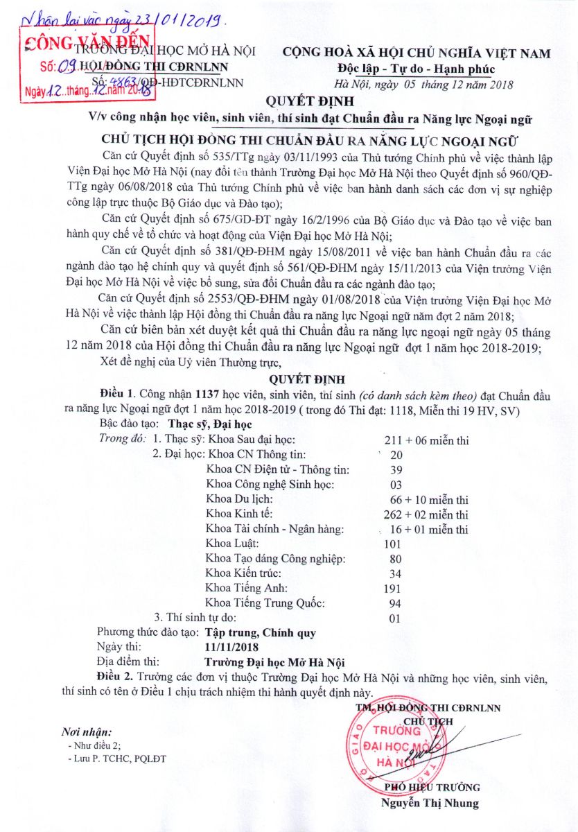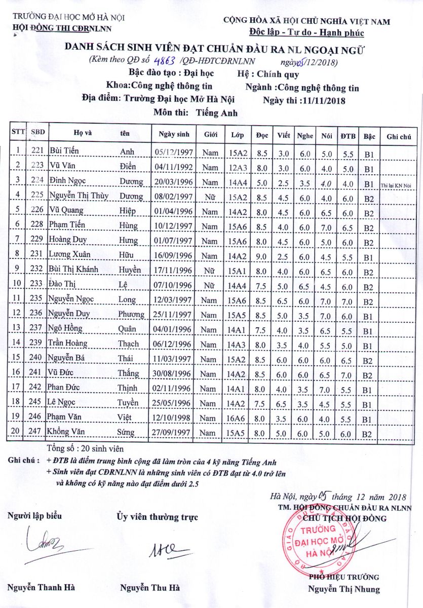 Kết quả thi chuẩn đầu ra NLNN đợt 3 (thi tháng 11) năm 2018