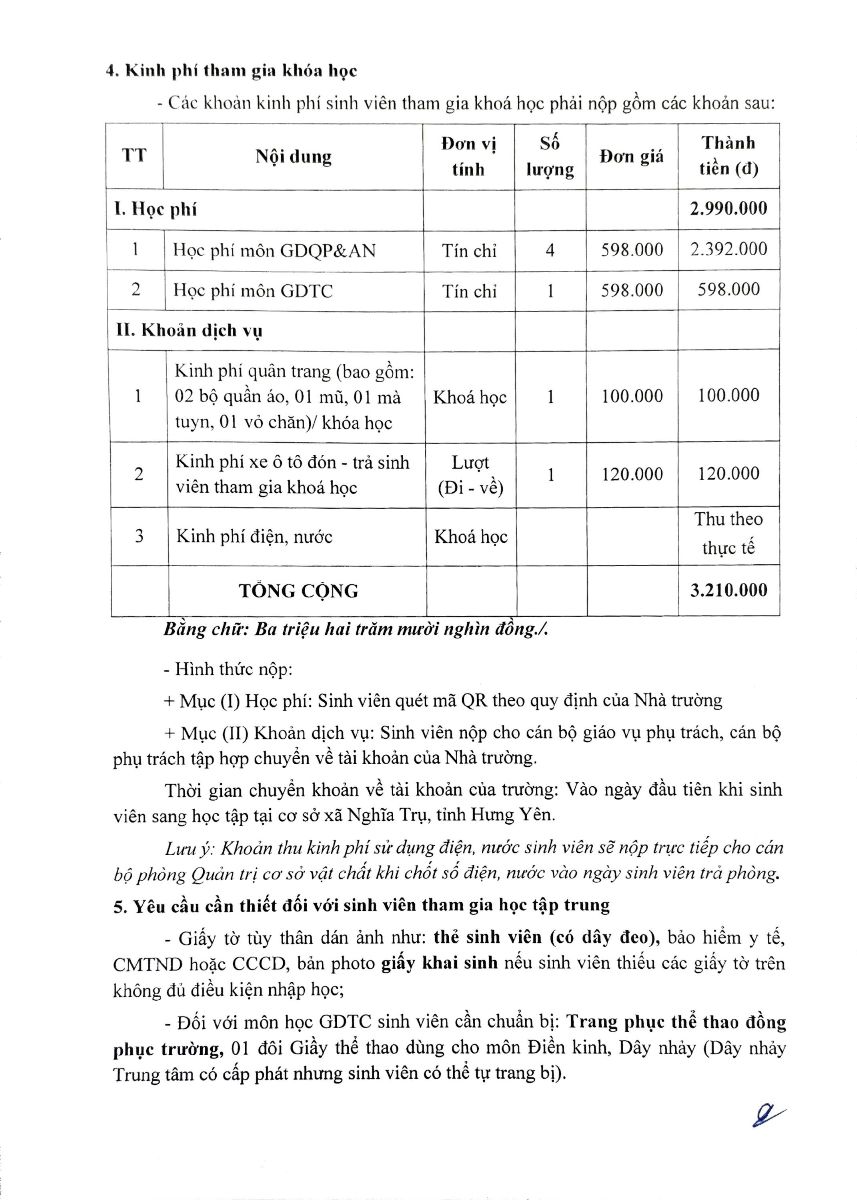 Đề nghị các sinh viên trong diện thu chuẩn bị đầy đủ kinh phí và đến đúng thời gian quy định để hoàn thành nghĩa vụ nộp kinh phí trước khi tham gia khóa học.
